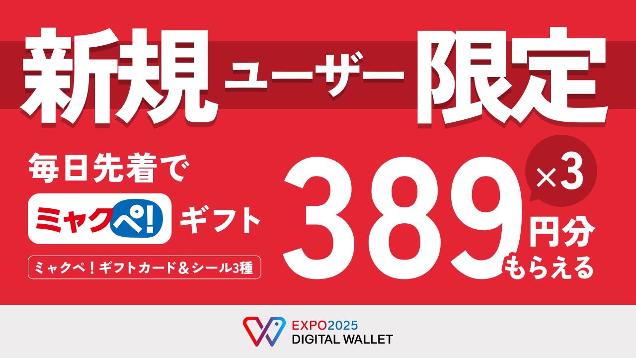 ラストスパートキャンペーン!2025年10月1日(水)より、ミャクペ!ギフトカード(389円)が、1枚⇒3枚に! 今からはじめても間に合う! 大阪・関西万博がもっとスペシャルになるアプリ 「EXPO2025デジタルウォレ... 詳しくはこちら
